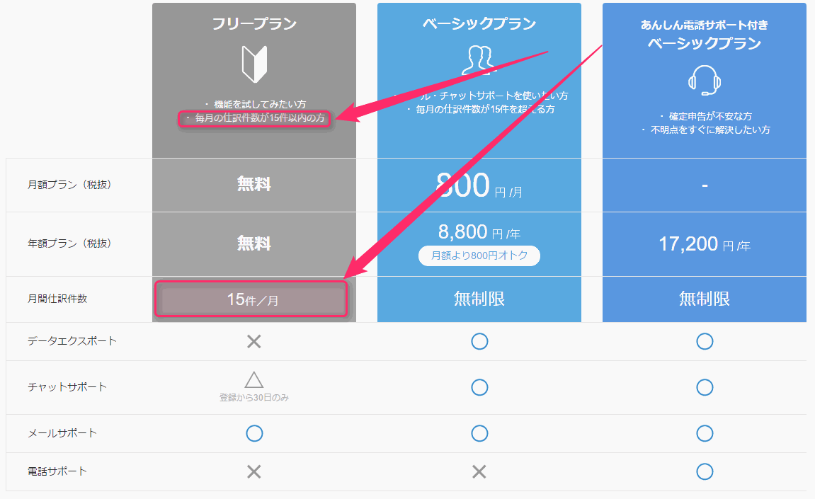 ▲この表記だと、「毎月15件仕訳できる権利が付与されるんだな!」って勘違いするでしょ。 「15件/月」の部分に、「一度でも15件を超えると有料会員にならないと仕訳できなくなります」って追記しておくべきでしょ。 |
