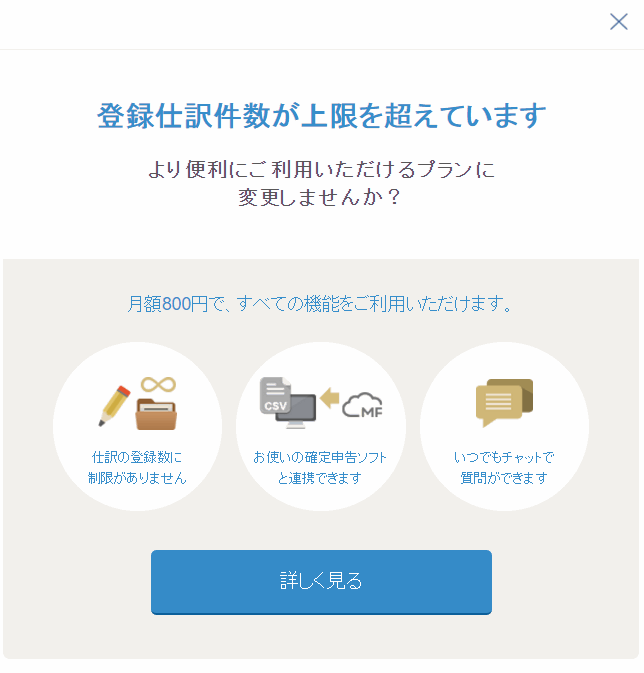 ▲15回以上仕訳をすると、コレが毎回でるようになる 「登録仕訳件数が上限を超えています より便利に利用できるプランに変更しませんか?」 |