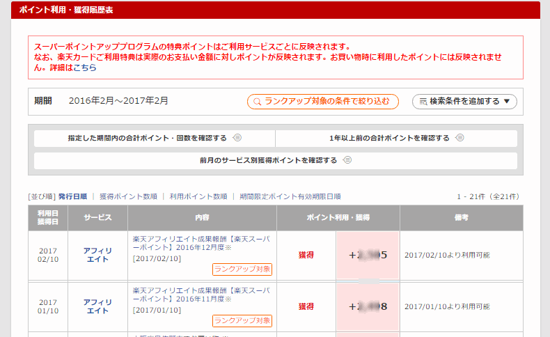 このページ(【楽天PointClub】:ポイント履歴)より確認できる。