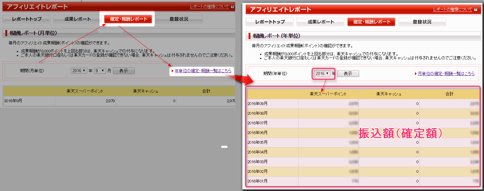 ▲「確定・報酬レポート」→「年単位の確定・報酬一覧はこちら」→ 報酬額を見たい年度を選択 (「振込額」=「1ヶ月前の確定額」となる) |