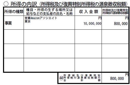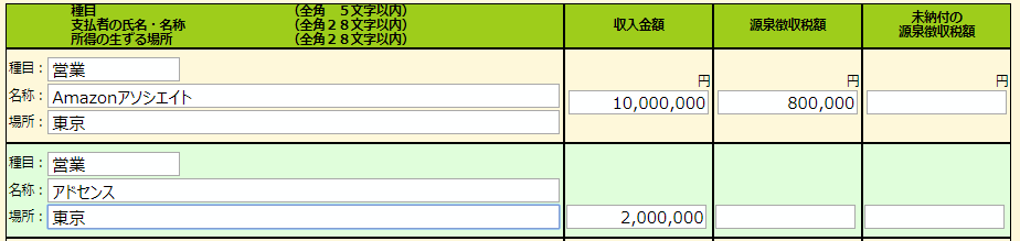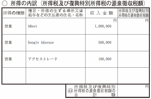 ▲こんな感じで、源泉徴収された収入だけを記入すれば良い (アフィリエイトの場合、源泉徴収されるASPは、今のところAmazonアソシエイトだけだと思うので、Amazonアソシエイトで源泉徴収されていない人は空欄のままで良い) |