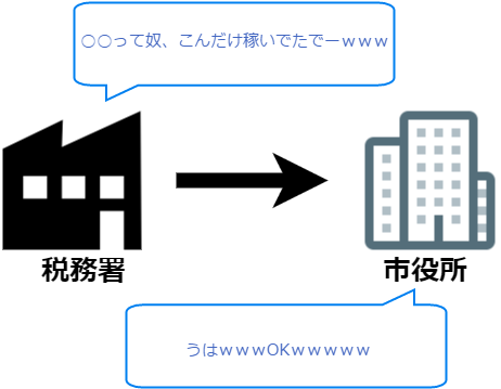 なぜなら、確定申告書を提出すると、「税務署」が「市役所」に対して「コイツこれだけ稼いでたよー」という風にチクるから。